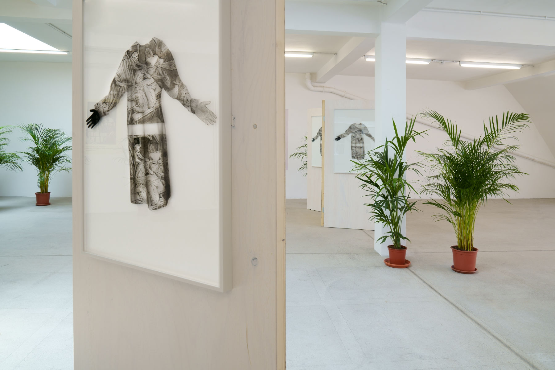Installations by Alexandra Hopf generate a feeling of dejà vu. This also applies to Musée des Chemises that – not just coincidentally – recalls Marcel Broodthaers’ mise-en-scènes. A lettering of the exhibition’s title and a painted monochrome surface with irregular outlines embellish the wall. Lined with potted palm trees a folding-screen, made of grained wood panels, cuts across the room. The panels display transparent reverse glass paintings, which visualize a cycle of disembodied images. They in turn bear likenesses, mounted on the panels like film sequences. The beginning was the original of a drawing by Pieter Bruegel the Elder. Broodthaers, also a master of reference, captured the drawings in a 1964 film essay entitled Bruegel et Goya, journalistes. The stills from this film reproduced in his publication Cinéma served as templates for Alexandra Hopf´s reproductions on glass. The respective interpretations through the ages overlap and create something original again.