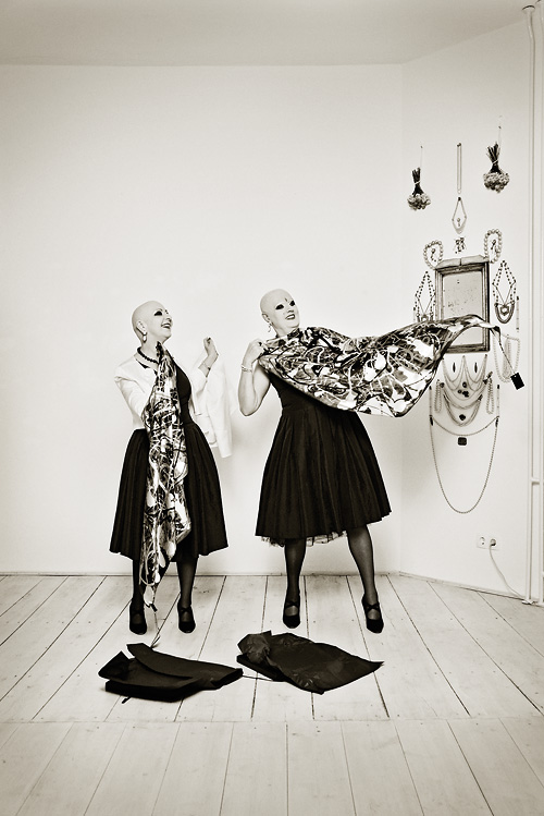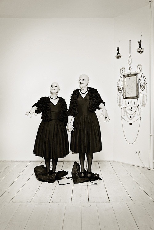 »COMING OUT OF THE FUTURE«, Berlin-based conceptual artist EVA & ADELE are, without any doubt, the german capital’s most influential artist duo. Apart from their appearances in the local art scene, EVA & ADELE can be spotted at all the major art shows around the globe. Spreading their message of smiling as a universal code of communication, EVA & ADELE’s art often happens independently from museums and gallery spaces- consequently their motto »WHEREVER WE ARE IS MUSEUM«. Continous repeating and systematic divergane are the core of their permormative experiment. Consequently, when asked about their biography, EVA & ADELE prefer to simply cite their artwork stats: