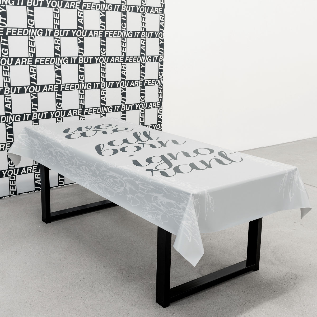 Imprinted tablecloth, imprinted wallpaper, rectangular table for six