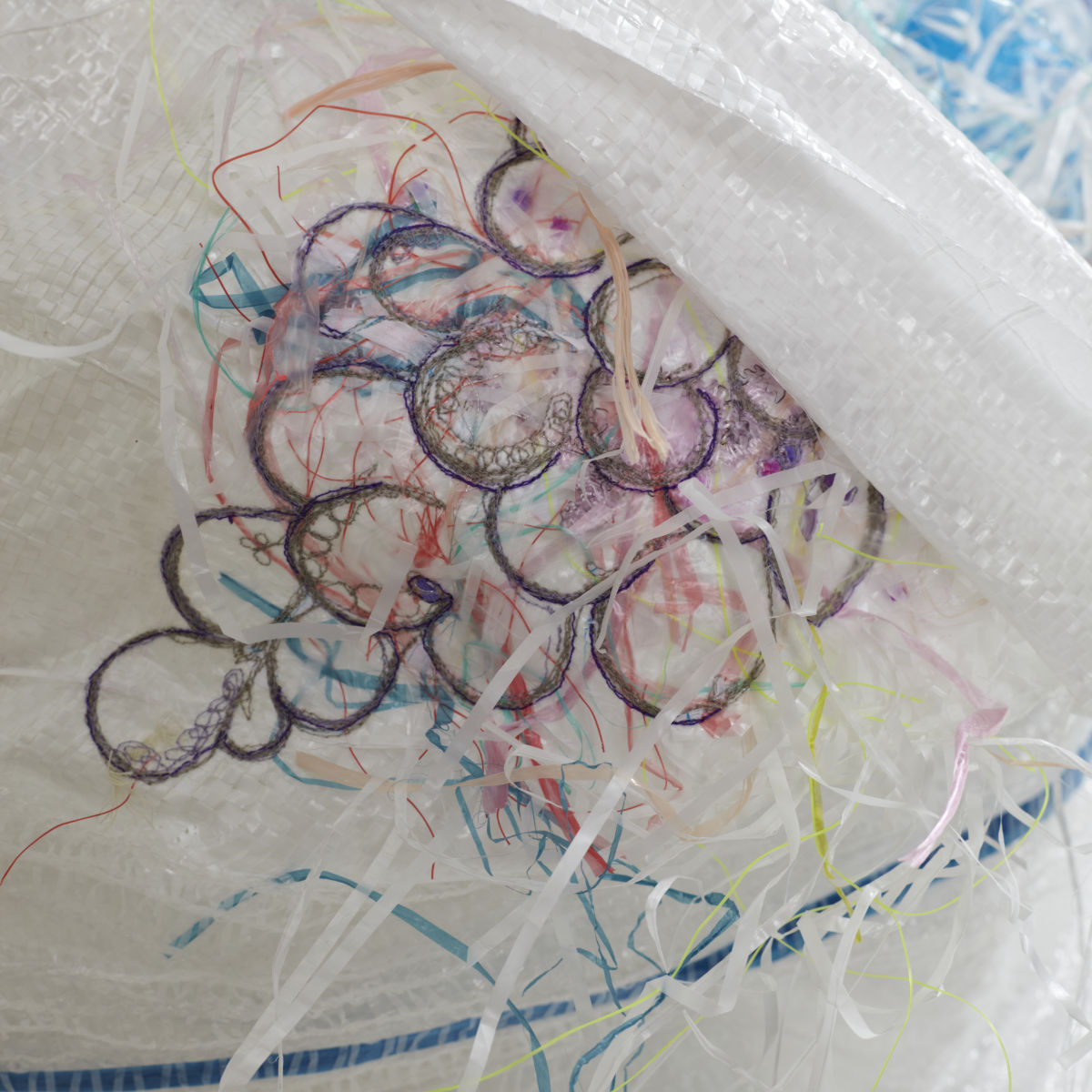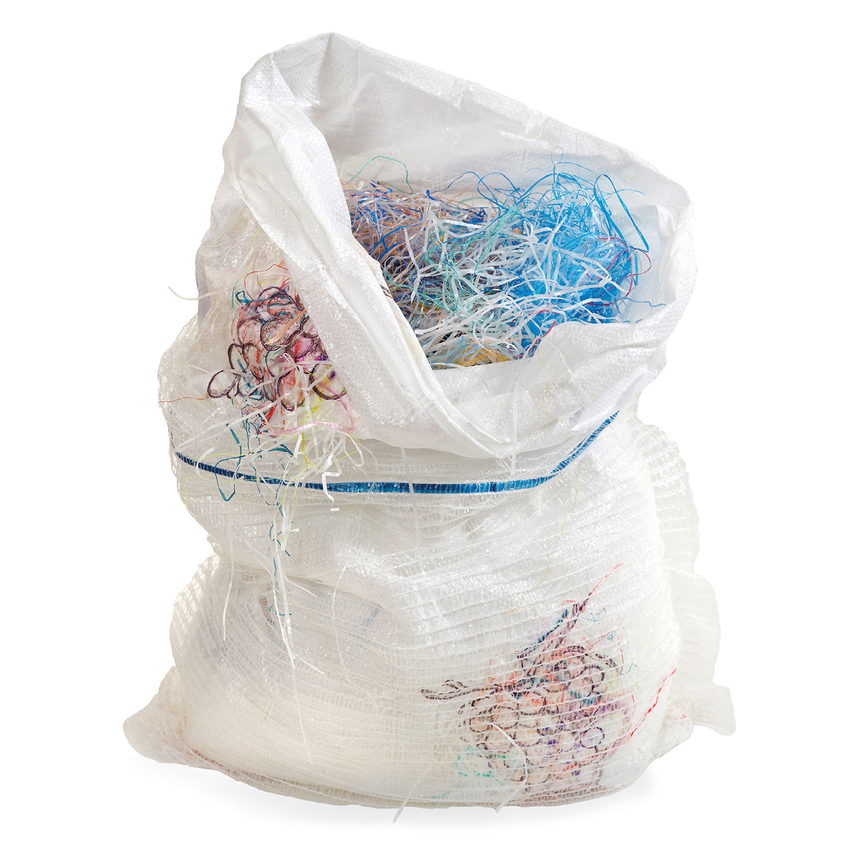 Embroidered oranges, applied on woven plastic bags filled with plastic fringes and rustling sacks / fruit-vegetables nets