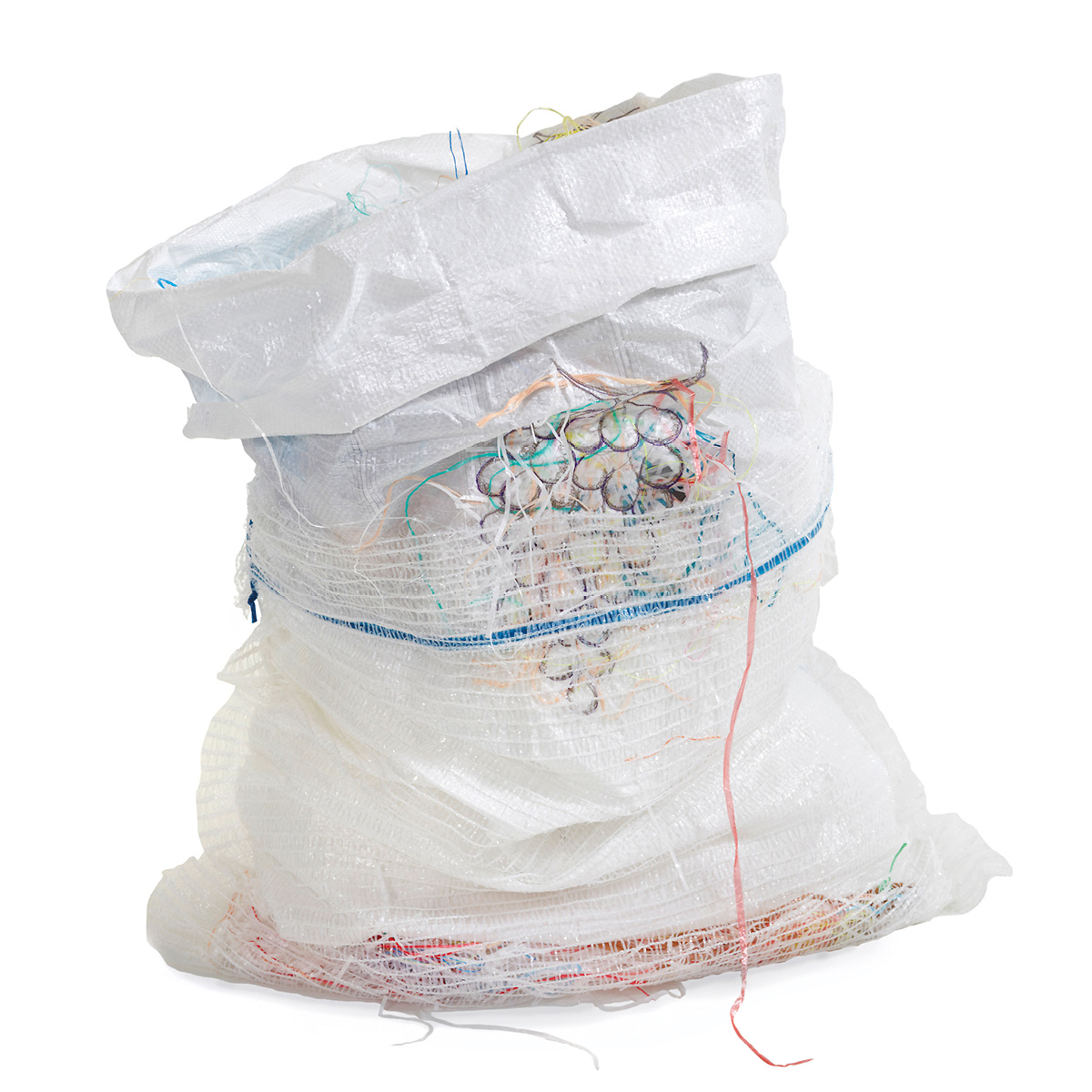 Embroidered grapes, applied on woven plastic bags filled with plastic fringes and rustling sacks / fruit-vegetables nets
