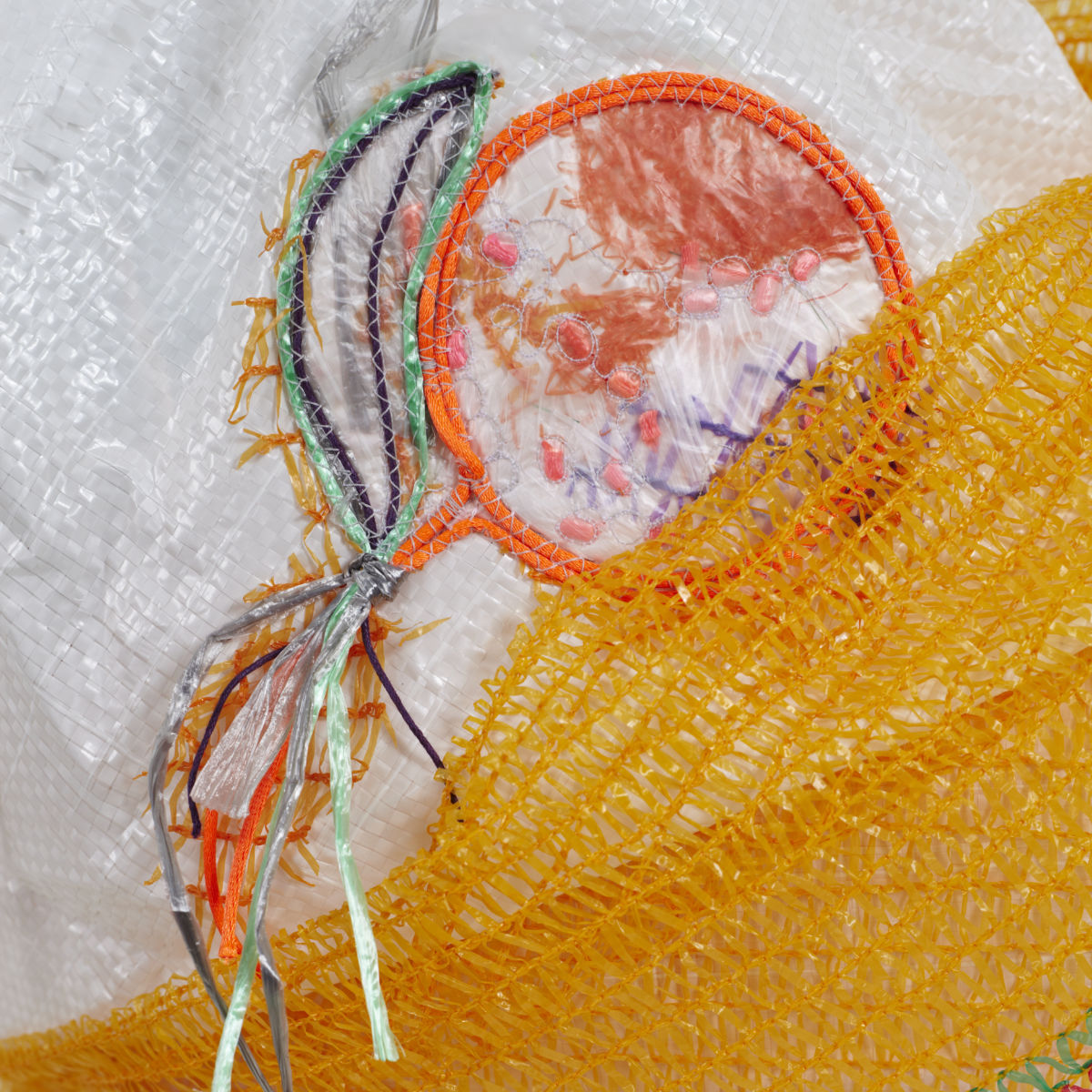 Fruit – vegetable nets with woven allovers, screen printed text band ‘Meloni Meloni’, hand embroidered letter embossment and fringe applications