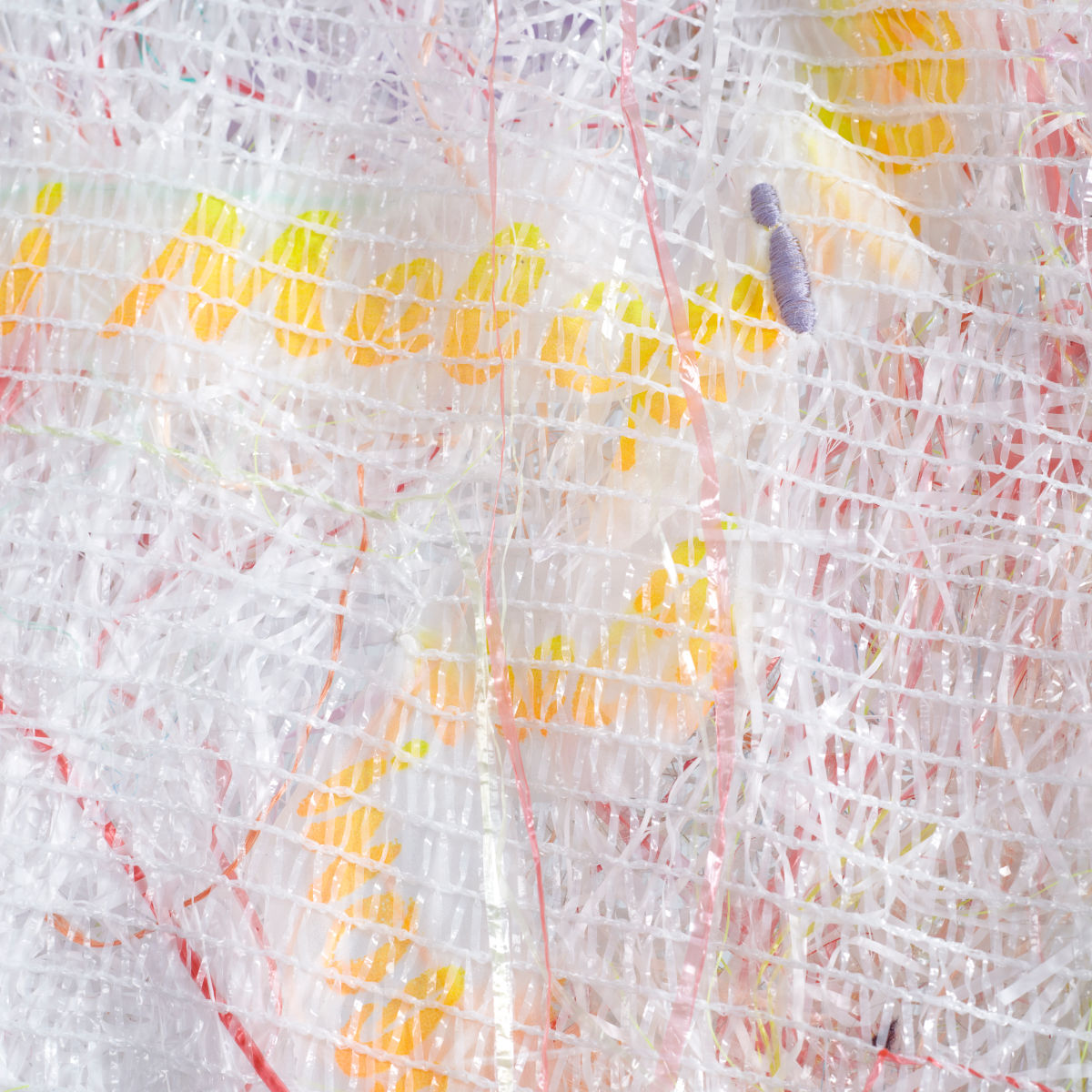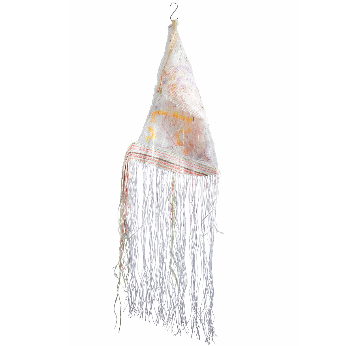 Fruit – vegetable nets with woven allovers, screen printed text band ‘Meloni Meloni’, hand embroidered letter embossment and fringe applications