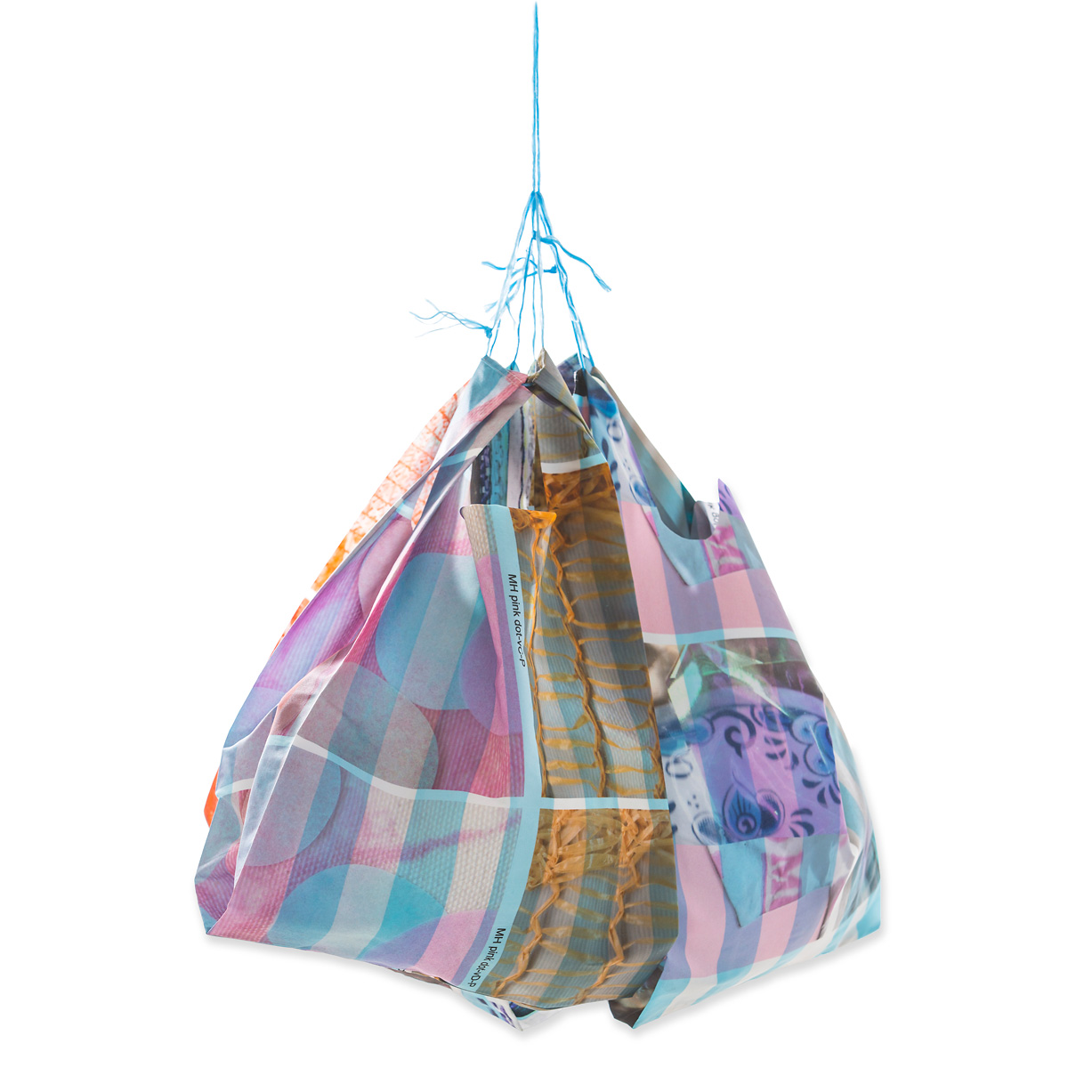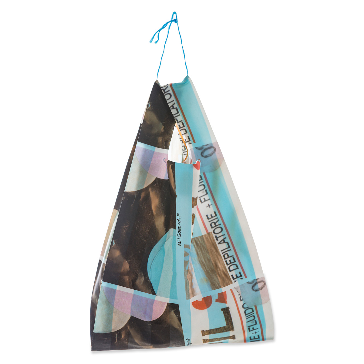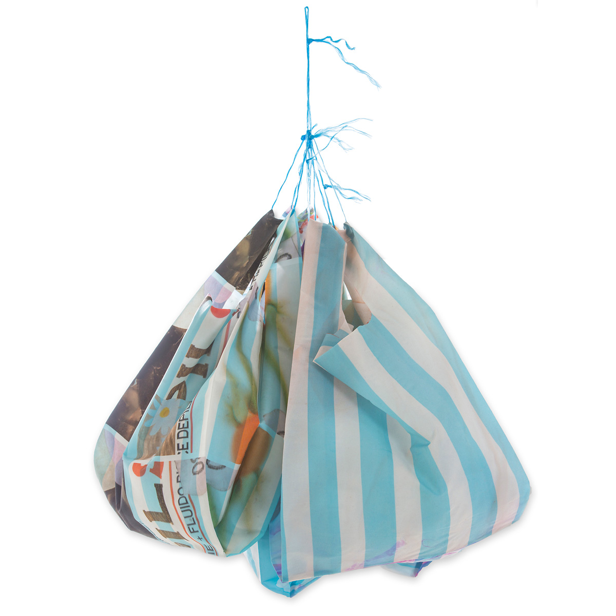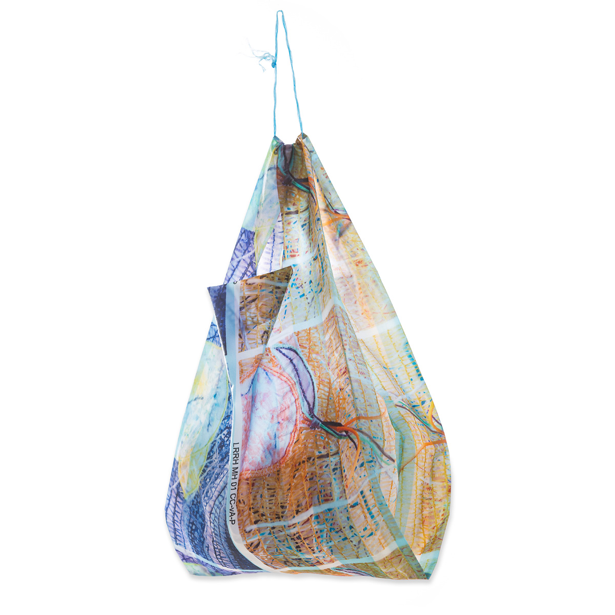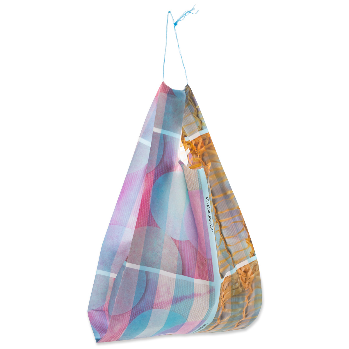 Fruit – vegetable nets with woven allovers, screen printed text band ‘Meloni Meloni’, hand embroidered letter embossment and fringe applications