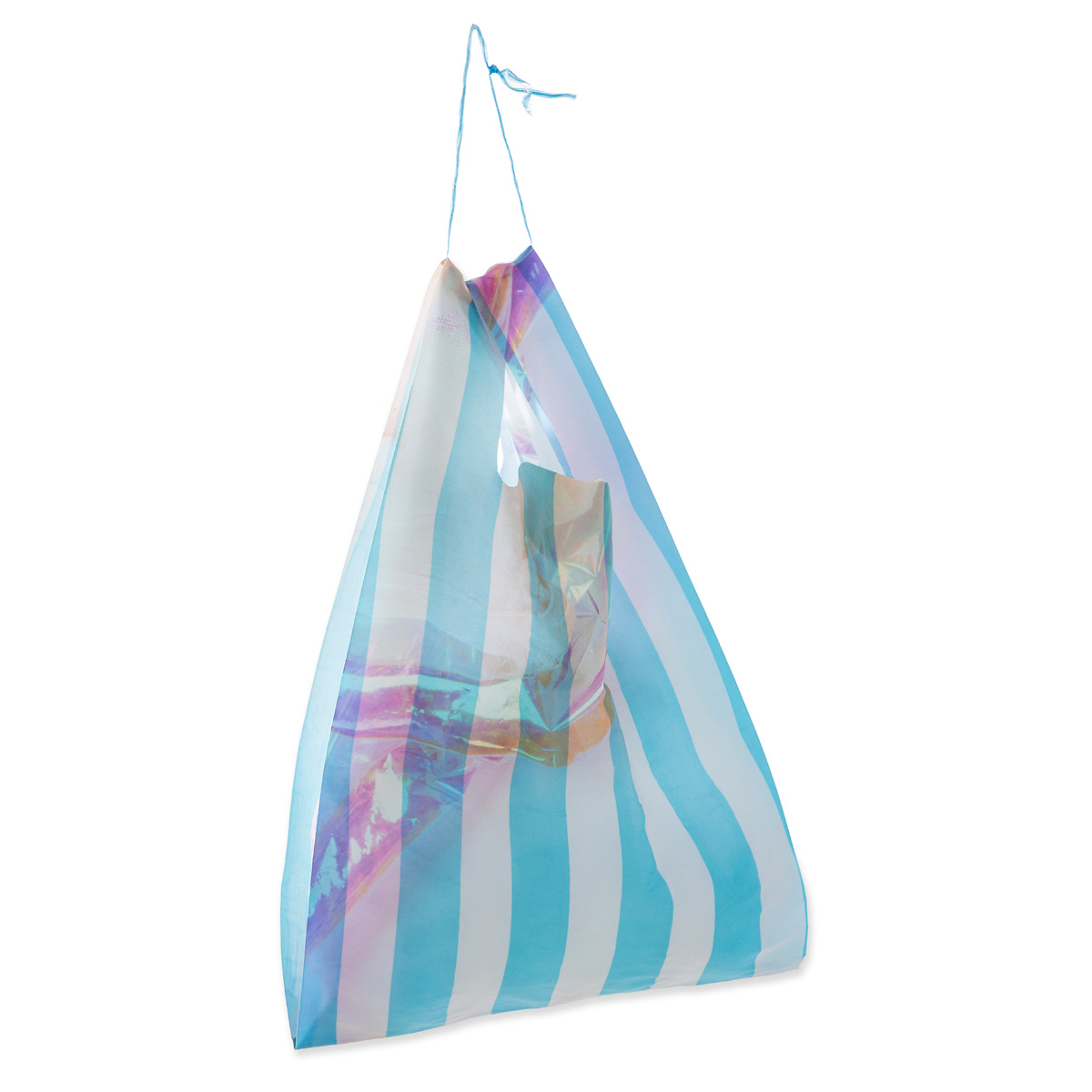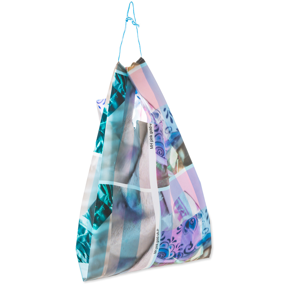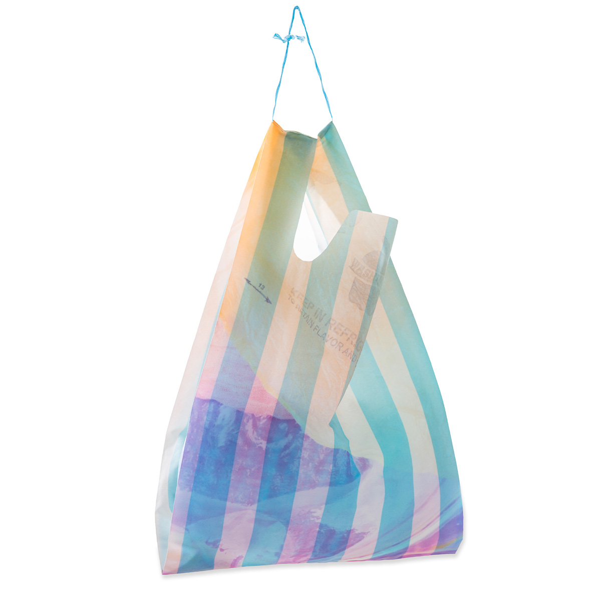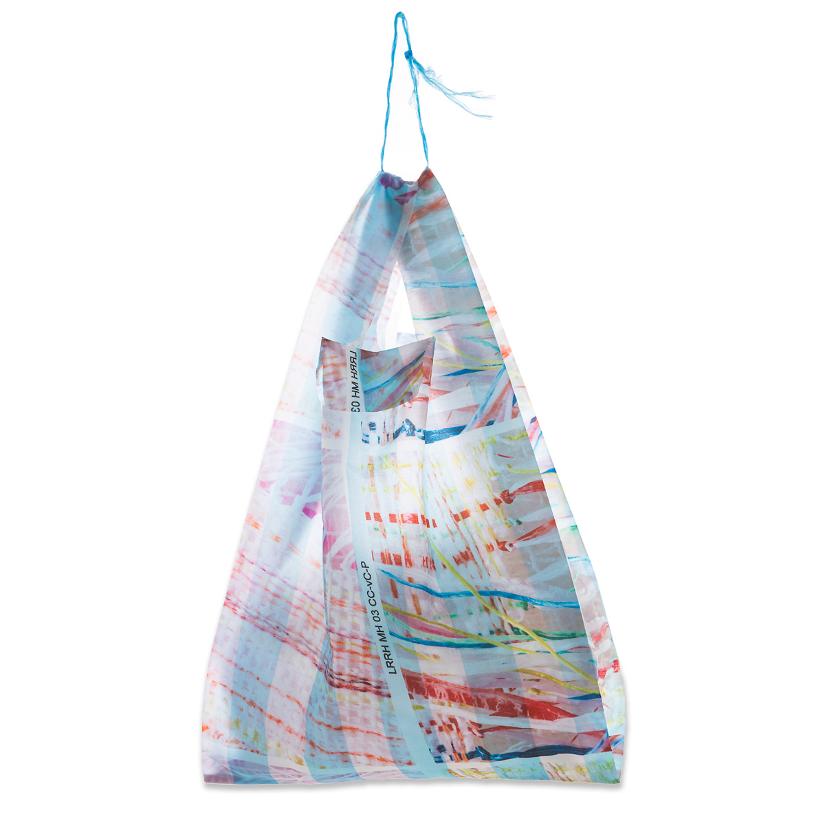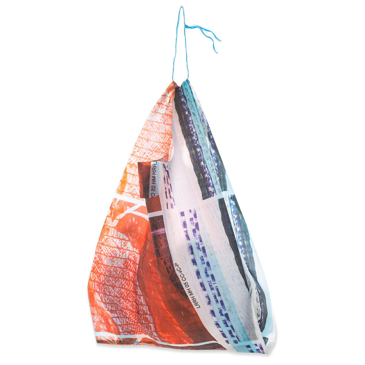 Fruit – vegetable nets with woven allovers, screen printed text band ‘Meloni Meloni’, hand embroidered letter embossment and fringe applications