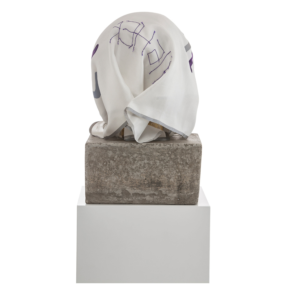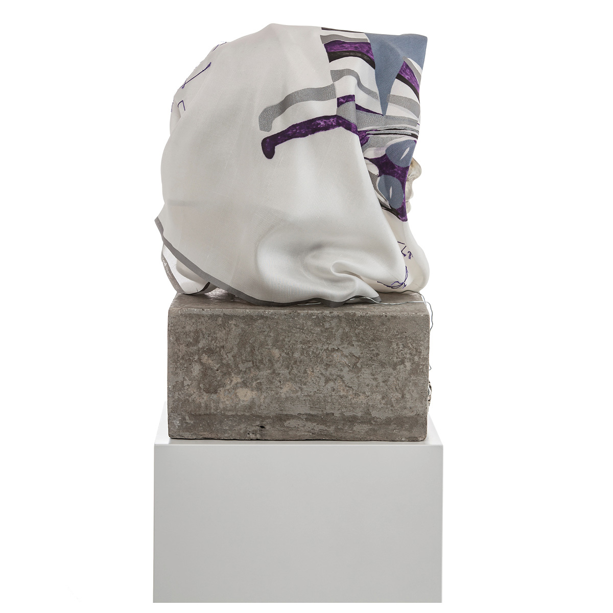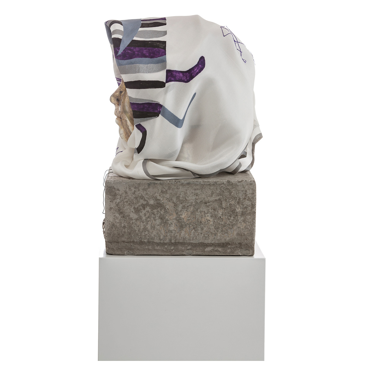 Ceramic head painted and glazed, concrete, chain, pink rubber rope and silk scarf